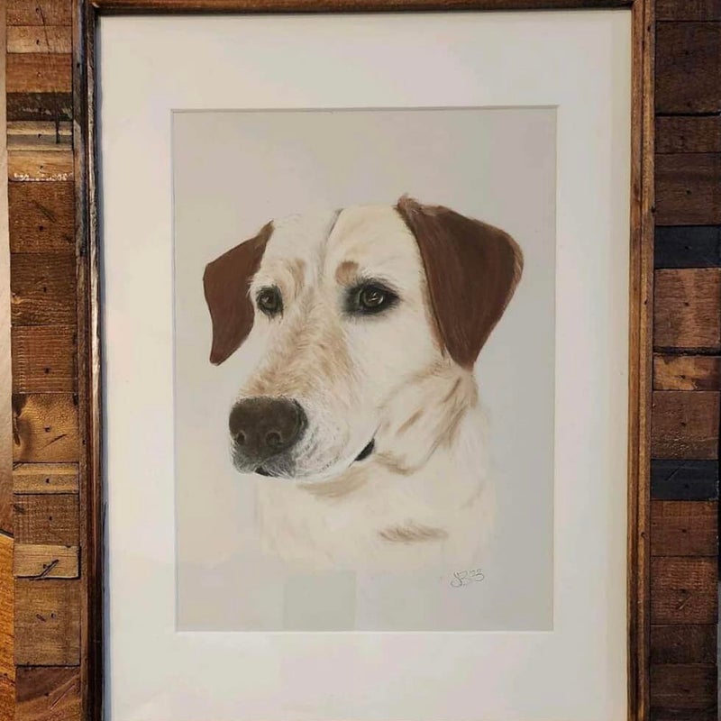 "Our beloved yellow lab passed away & we were gifted a Jaymie original portrait of our Gibson! It brought tears to my eyes! It's amazing..her attention to detail is exceptional. She is soo talented! We love our portrait & it now hangs in our living room where we can see our boy everyday! We absolutely love it! Thank you again Jaymie for the beautiful piece & sentiment behind it! It means the world! I would highly recommend Jaymie & look forward to gifting a portrait by Jaymie to someone else down the road!❤️"